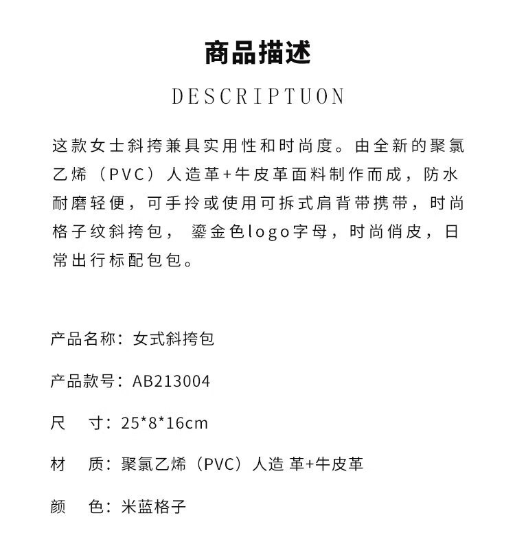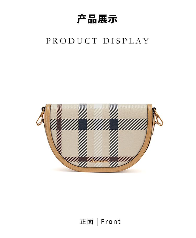 商品名称:AQUASCUTUM雅格狮丹礼物送女友通勤休闲斜挎包格纹拼皮革月牙背包 米蓝格子