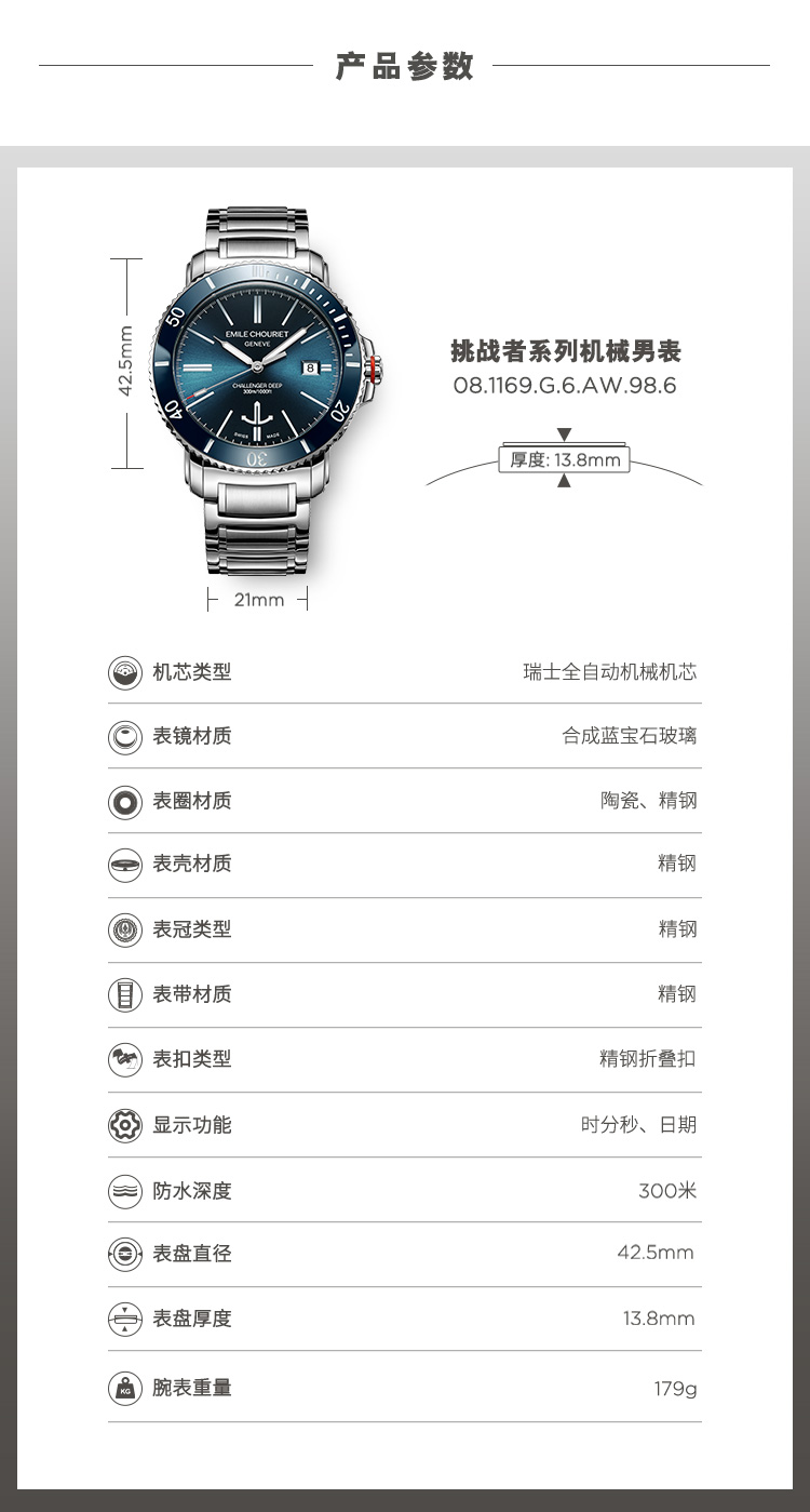 商品名称:艾米龙(Emile Chouriet)瑞士手表 挑战者 夜光潜水表机械表男表礼物08.1169.G.6.AW.98.6