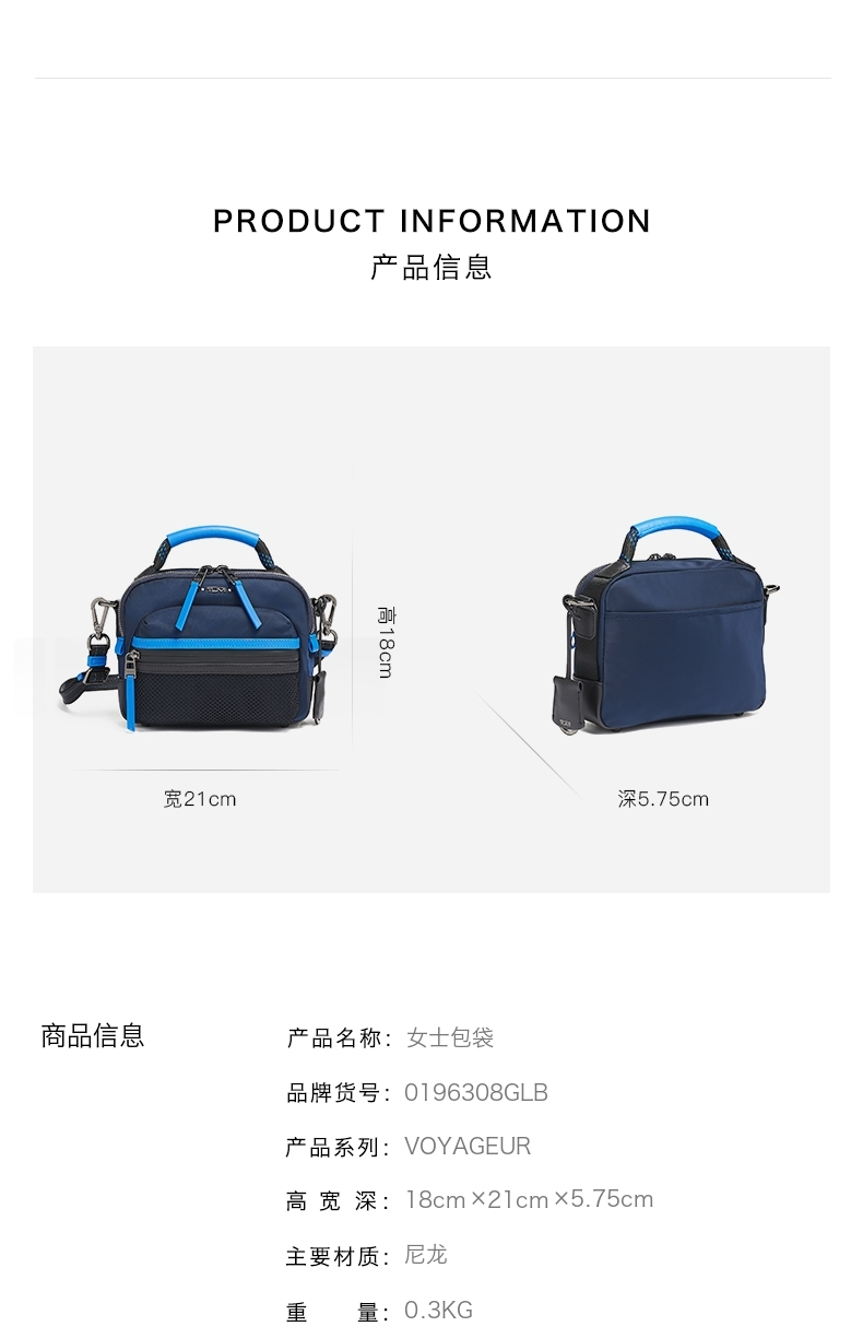 商品名称:TUMI/途明Voyageur系列冰河蓝时尚女士单肩斜挎背包 冰川蓝/0196308GLB